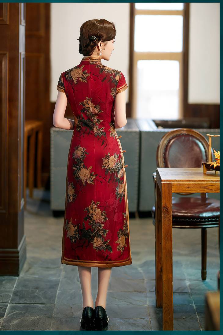 Cheongsam Longue Rouge Avec Motifs Floraux Et Garnitures Dorées – Hongli
