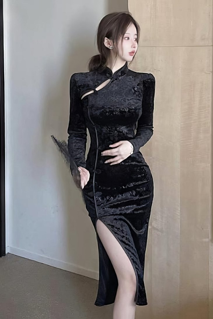 Cheongsam Moulante En Velours Noir Fendue – Jingyi