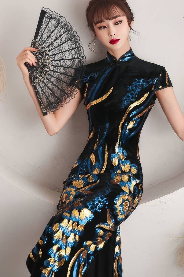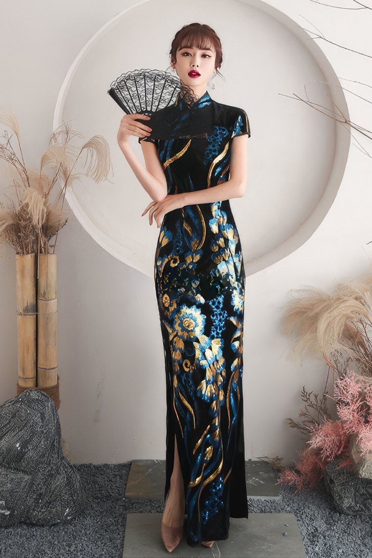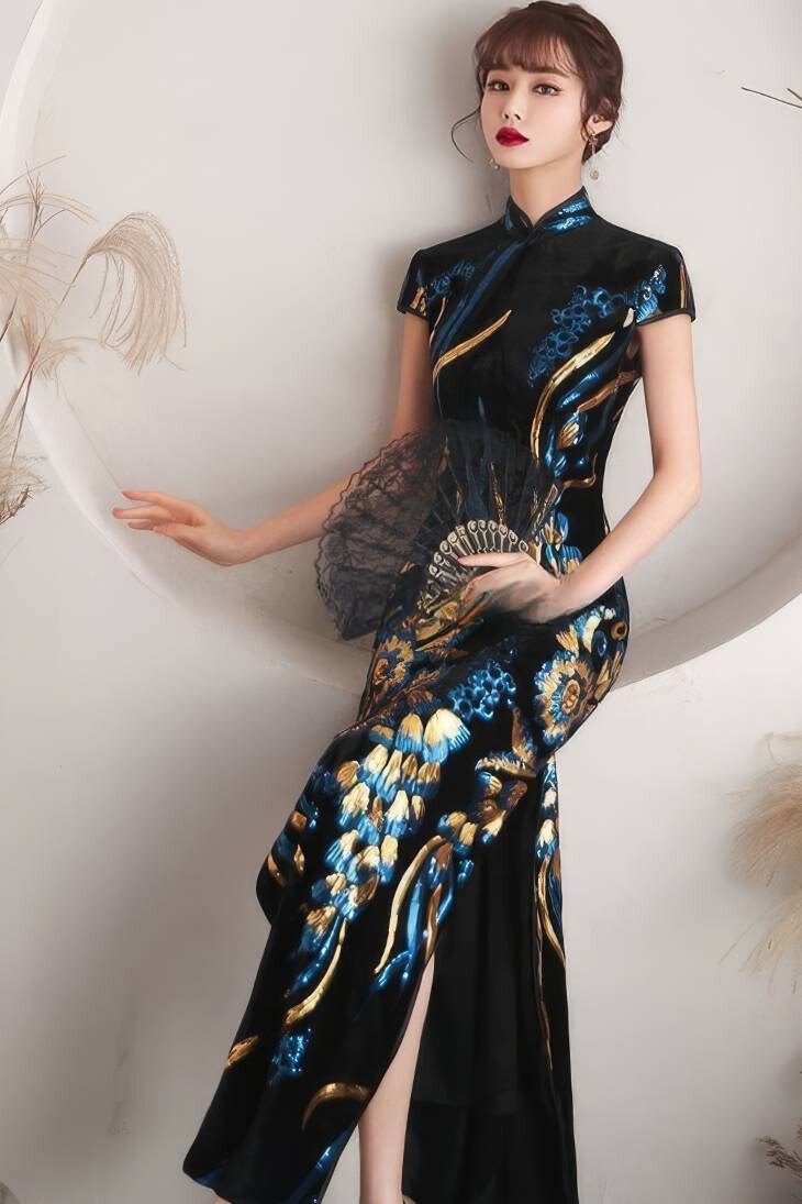 Robe Chinoise En Velours Noir Brodée Bleu Et Or Fendue – Lingxue